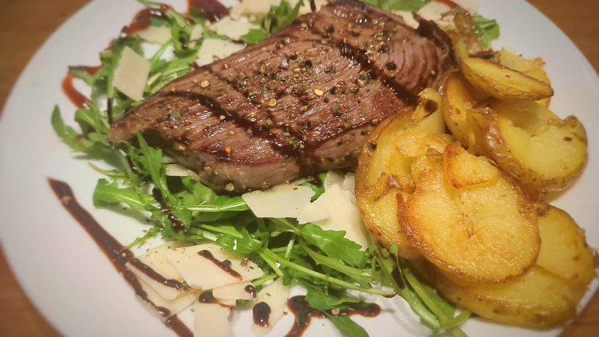 Heute mal wieder was aus der Rubrik Fleisch  feinstes argentinisches Rindersteak, angerichtet auf einen Teppich von Rucola mit Parmesansplitter und dazu Knoblauch-Bratkartoffeln. Verfeinert mit Balsamico Creme und einer guten BBQ Sauce und natürlich guter schwarzer Pfeffer. Ich kann euch sagen… lecker war’s…