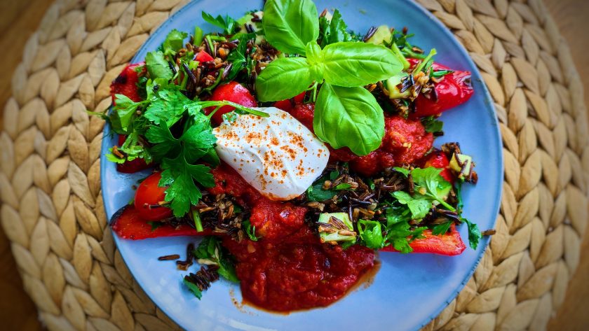 🫑 geröstete Paprika mit schwarzem Reis und dazu eine mediterrane Tomatensauce verfeinert mit frischer Petersilie und Koriander