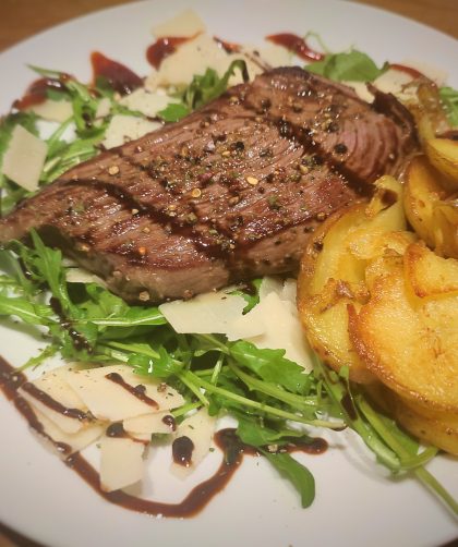 Heute mal wieder was aus der Rubrik Fleisch feinstes argentinisches Rindersteak, angerichtet auf einen Teppich von Rucola mit Parmesansplitter und dazu Knoblauch-Bratkartoffeln. Verfeinert mit …