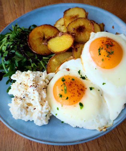 Knoblauch-Bratkartoffeln mit Spiegelei und dazu Rucola sowie Körniger Frischkäse. Verfeinert mit Pfeffer, Balsamico Creme und Petersilie.