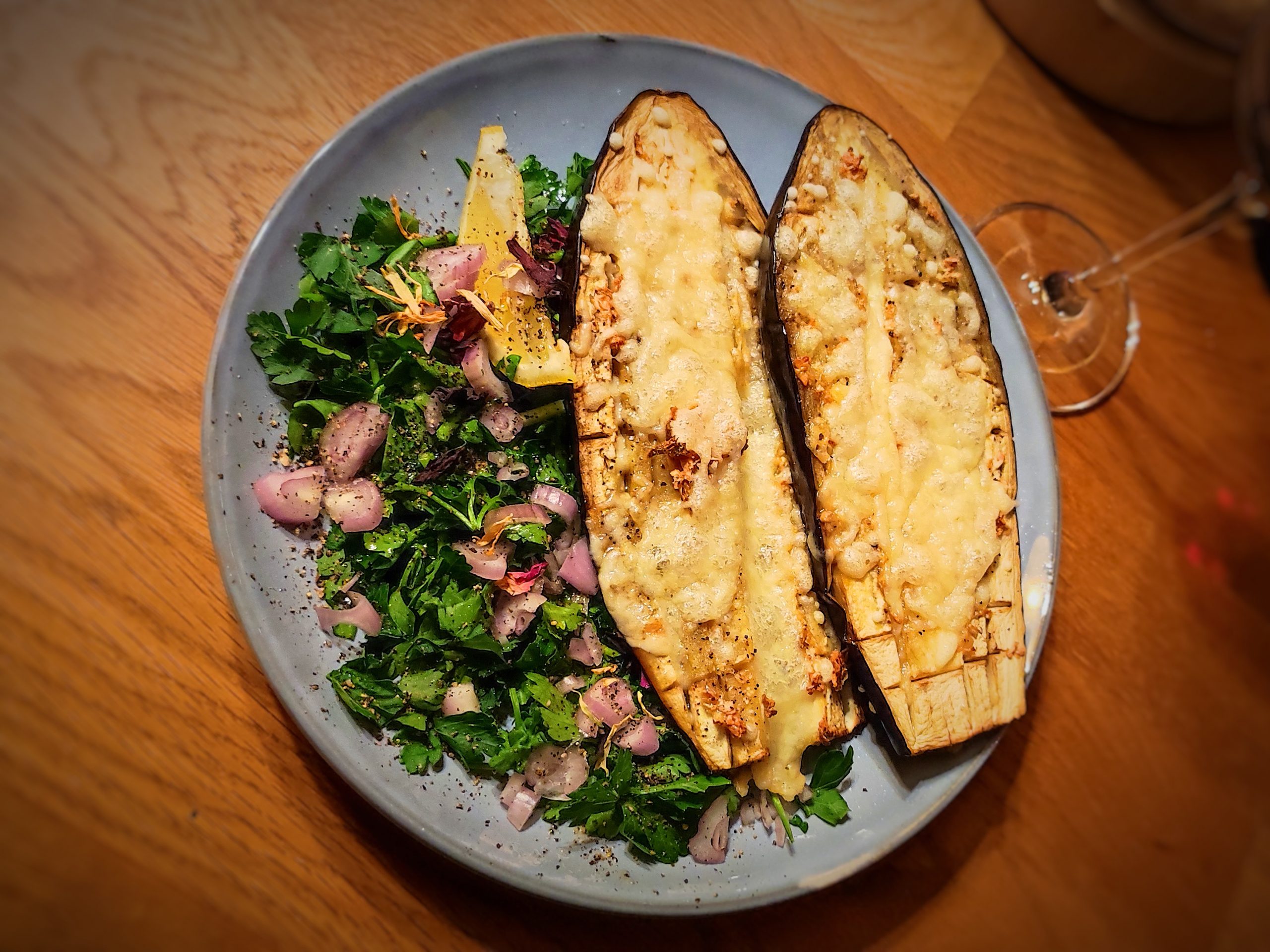 🍆 🧀 Überbackene Auberginen angerichtet mit glatter Petersilie und Koriander