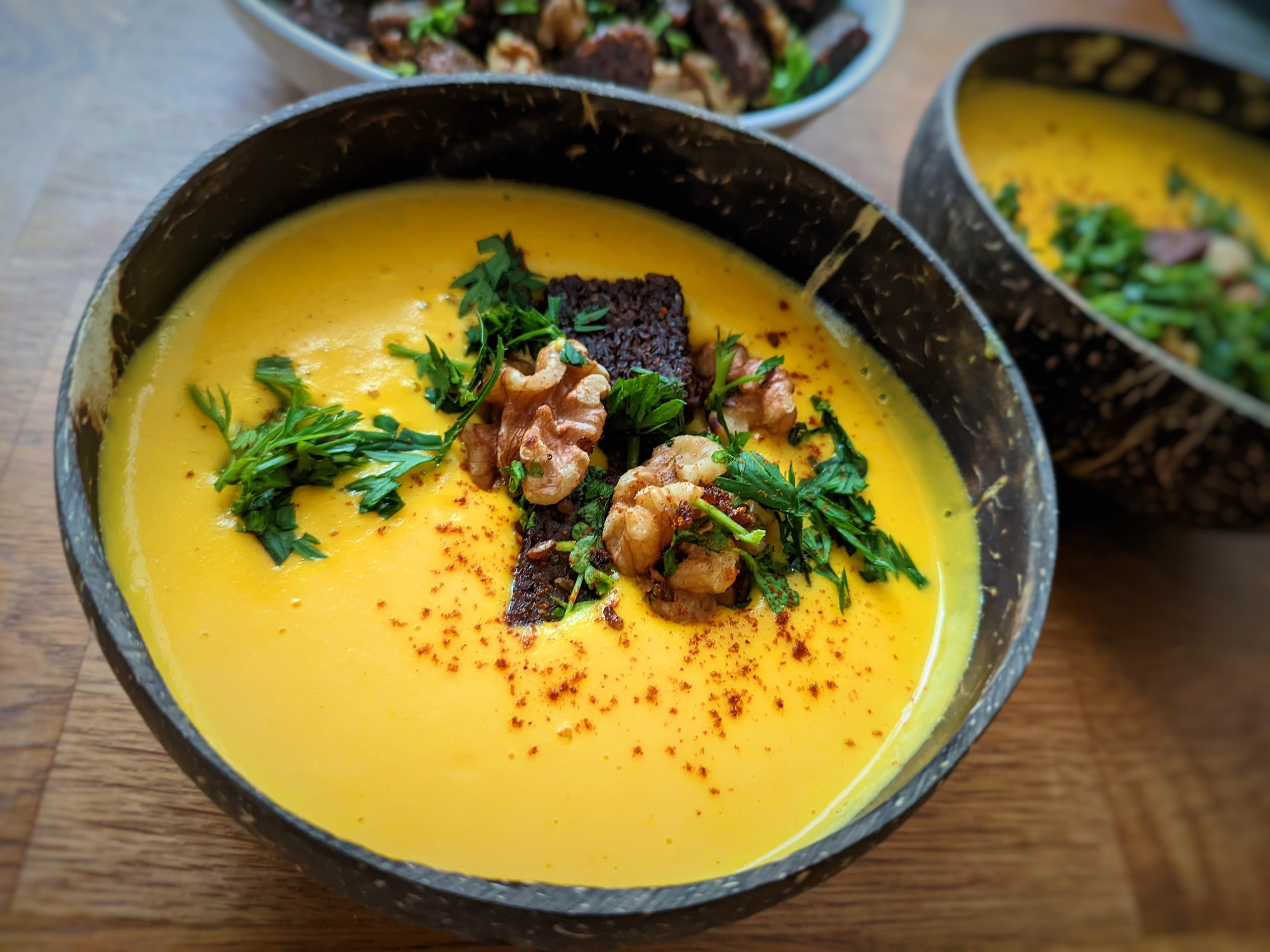 🥕🥔 Fruchtige Möhren-Kartoffelsuppe mit geröstetem Pumpernickel und Wallnüssen, angerichtet mit Petersilie sowie Möhrengrün 🍲👍