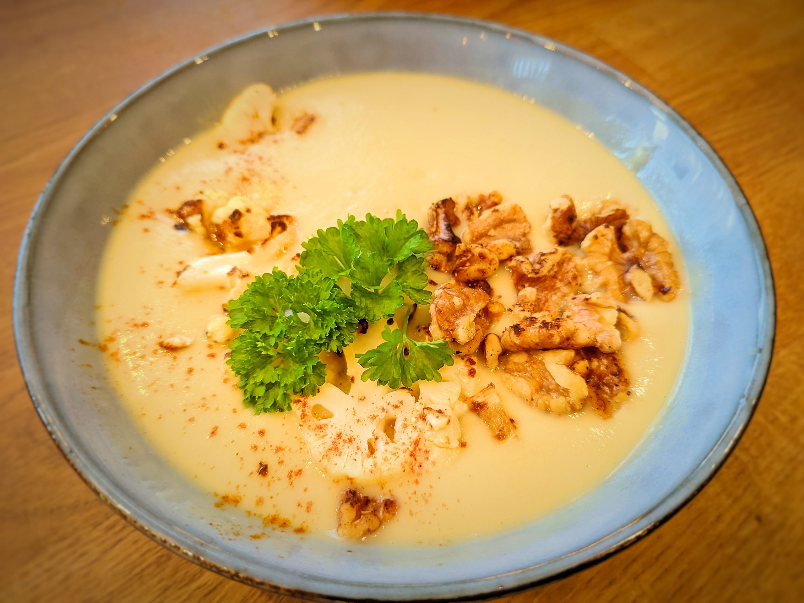 🍲 Blumenkohlsuppe angerichtet mit gerösteten Wallnüssen und Petersilie
