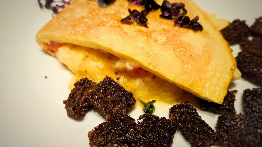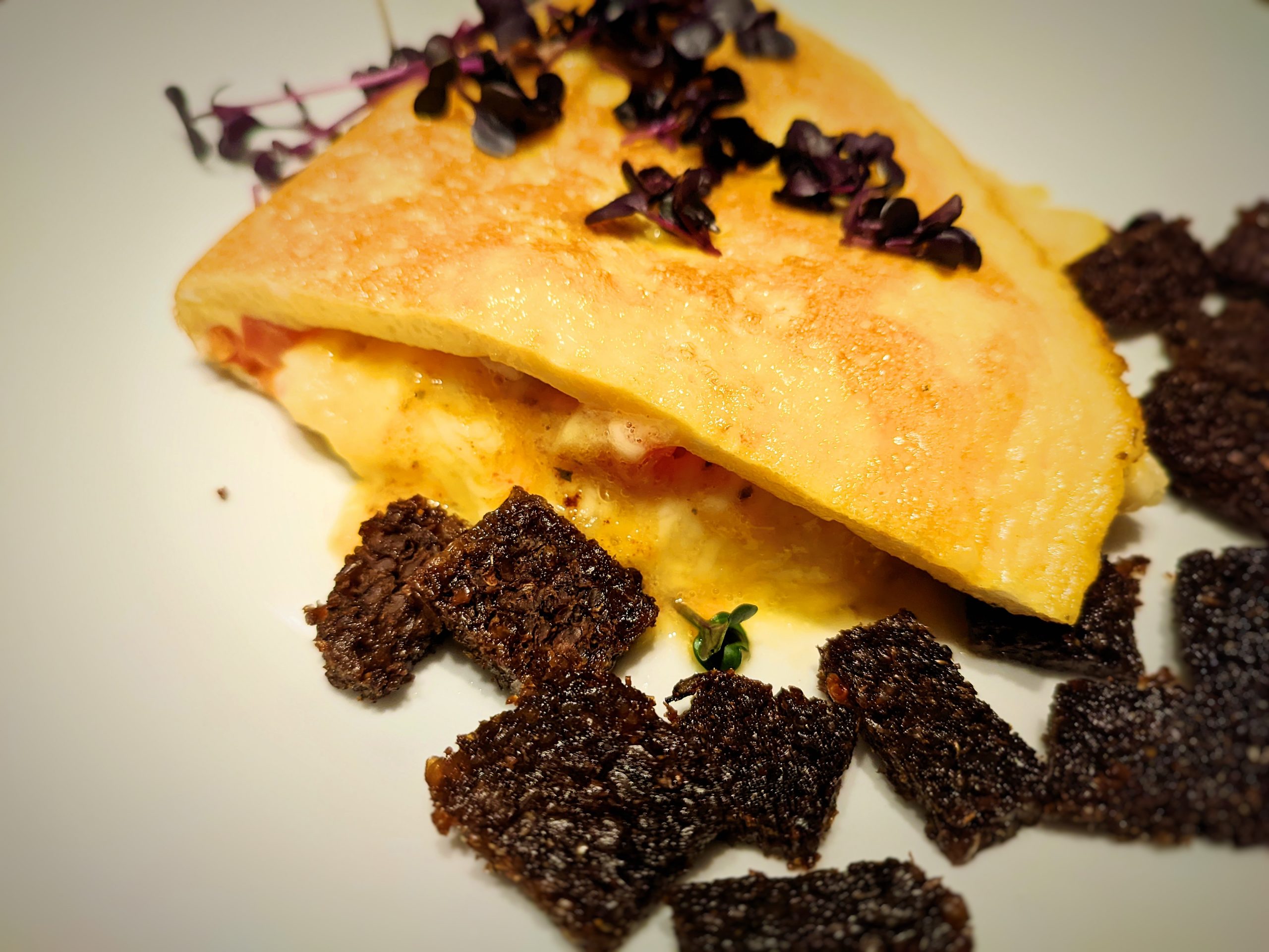 Tomaten-Käseomlette mit Knoblauchpumpernicker und Rote-Rettich Kresse
