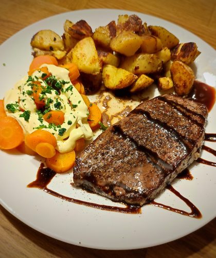 Heute mal wieder was aus der Rubrik Fleisch feinstes argentinisches Rindersteak, angerichtet auf einen Teppich von Rucola mit Parmesansplitter und dazu Knoblauch-Bratkartoffeln. Verfeinert mit …